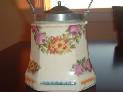 Antique English Cookie Jar Biscuit Barrel Art Deco flowers