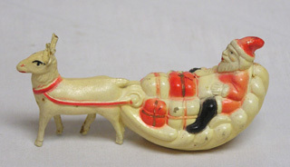 Title (ebay affiliate link): Vintage Christmas Celluloid Santa with Packed Sleigh Pulled by Reindeer