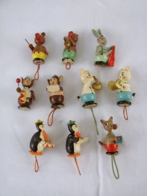 Title (ebay affiliate link): VTG Lot (10) Early Handmade Wooden Christmas Tree Ornaments Animal Musical Group