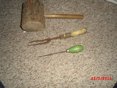Primitive Kitchen Utensils- Mallet fromTree Trunk, Ice Pick & Carved Stag Handle