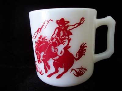 Title (ebay affiliate link): Vintage Hazel Atlas Child's Cup - White Milk Glass with Red Cowboy & Indian