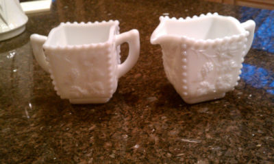 Title (ebay affiliate link): Milk Glass Creamer and Sugar Bowl (Westmoreland Paneled Grape Design) BEAUTIFUL!