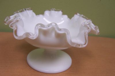 Title (ebay affiliate link): White Milk Glass Stemmed 4" Tall Clear Ruffle Edge Candy Dish