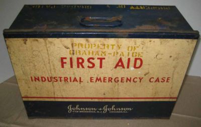 Title (ebay affiliate link): Graham-Paige Factory First Aid Kit Johnson & Johnson Vintage Industrial Kit