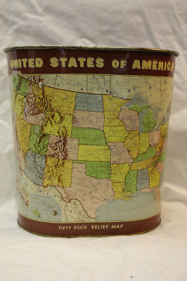Title (ebay affiliate link): 1961 Weibro Corp Metal US of America 50 State Relief Map Trash Can Wastebasket