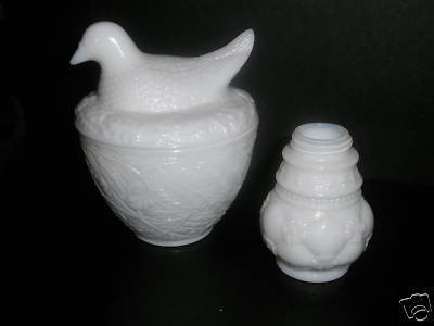 AVON MILK GLASS COVERED DISH AND VINTAGE CONTAINER