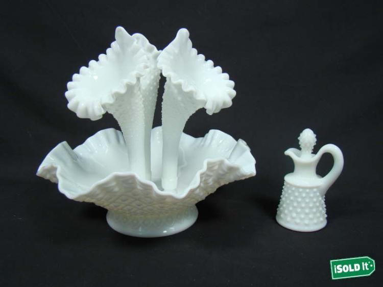 FENTON HOBNAIL MILK GLASS EPERGNE + CRUET