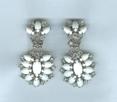 VINTAGE RHINESTONE-MILK GLASS DANGLE EARRINGS BY GALE