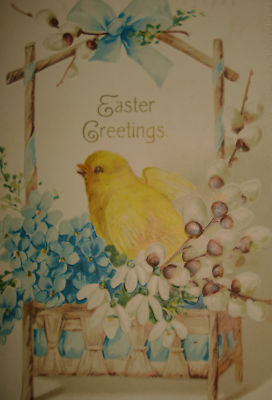 OLD VINTAGE HOLIDAY EASTER postcard BASKETFUL BLUE & WHITE FLOWERS - BABY CHICK