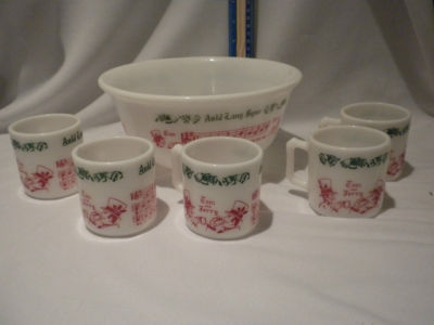 Vintage HAZEL ATLAS Tom and Jerry Milk Glass punch bowl 5 cup/mug Auld Long Syne