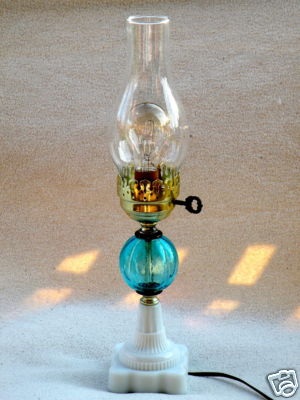 Title (ebay affiliate link): VTG HURRICANE STYLE TABLE LIGHT LAMP+KEY TURN SWITCH+MILK GLASS BASE+BLUE GLASS