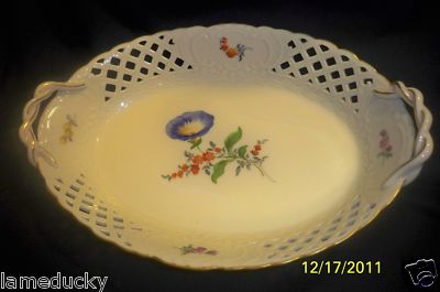 Title (ebay affiliate link): Antique Meissen Latticework Oval Bowl Twist Handle 10"X7"Posies Marked