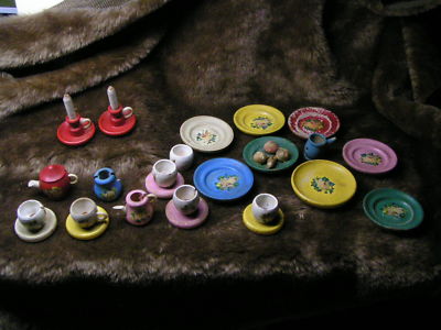Title (ebay affiliate link): ANTIQUE/VINTAGE 20 PIECE SET OF DOLL HOUSE FURNITURE DISHES CUPS CANDLE STICKS
