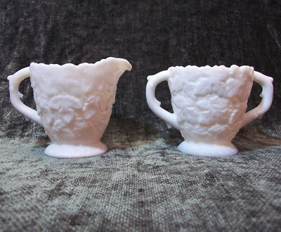 Title (ebay affiliate link): Elegant Westmoreland Milk Glass Maple Leaf Pattern Creamer & Sugar Line # 1928