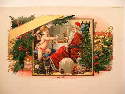 Title (ebay affiliate link): Set 2 Antique 1910 Christmas Santa Clause Angel Smoking Cigar Paper Box Label