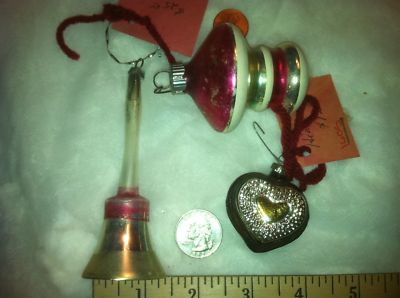 Title (ebay affiliate link): 3 Rare ANTIQUE Glass Christmas ORNAMENTS Bell, Heart, Top