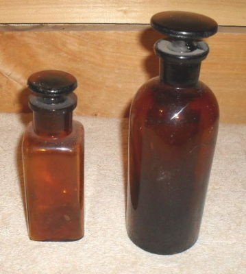 Title (ebay affiliate link): 2 ANTIQUE BROWN GLASS MEDICINE BOTTLES WITH GLASS STOPPERS
