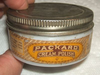 Title (ebay affiliate link): Vintage Packard Cream Polish Leather Dressing Hazel Atlas Milk Glass Jar