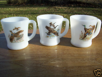Title (ebay affiliate link): 3 Vintage Fire-King Milk Glass Mugs - Canada Goose, Mallard Duck & Ruffed Grouse
