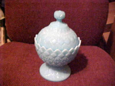 Title (ebay affiliate link): Lidded Blue Milk Glass Candy Dish-Compote-V/O/C Mark-Beautiful-Excellent Conditi