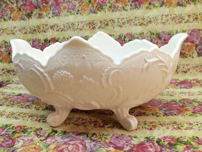 Title (ebay affiliate link): Vintage Jeannette Pink Milk Glass 10 1/2 Inch Long Lombardi Footed Bowl