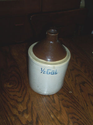 Title (ebay affiliate link): ANTIQUE POTTERY JUG-MARKED 1/2 GALLON IN BLUE-BROWN & CREAM-NO MAKER MARK-GC