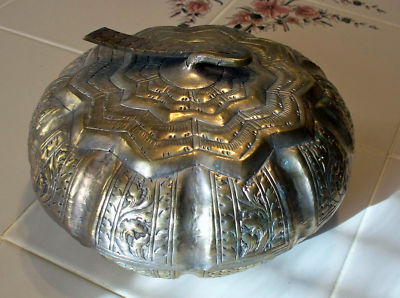 Title (ebay affiliate link): RARE * Ornate Brass Pumpkin Shape Lidded Bowl Jar Box Dish 9 inch by 4 inch high