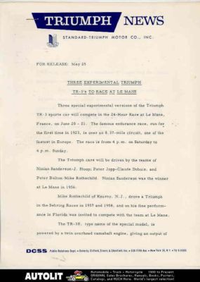 Title (ebay affiliate link): 1959 Triumph TR3 TR3S Race Car at Le Mans Press Release