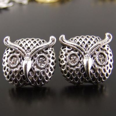 antique silver tone cute owl head earring stud