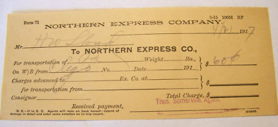 Title (ebay affiliate link): 1917 NORTHERN EXPRESS COMPANY Railroad Shipping Receipt From Chicago