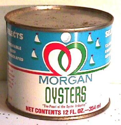 12 OZ MORGAN OYSTERS TIN OYSTER CAN WEEMS VA 92 W F MORGAN & SONS INC.