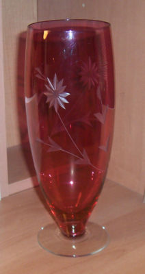 ETCHED GLASS CRANBERRY/ROSE 10" VASE W/FORAL DESIGN