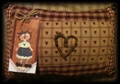 Title (ebay affiliate link): Primitive Country Raggedy Tag Heart Homespun Shelf Sitter Pillow