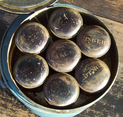 Title (ebay affiliate link): ANTIQUE TIN CONTAINER WITH 7 ROUND SPICE CANS. !!!