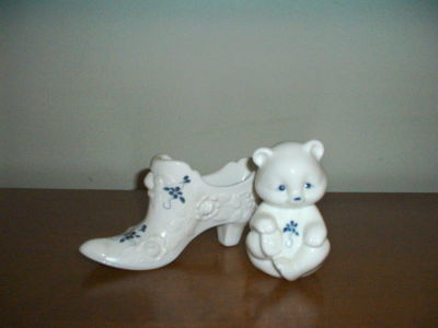 Fenton Shoe & Bear - Milkglass with Blue Floral Design
