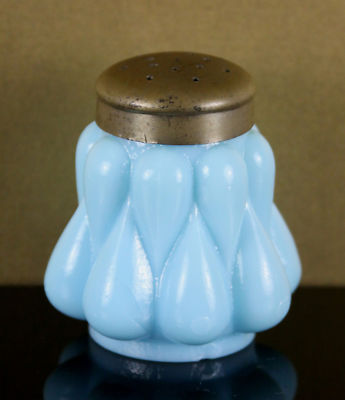 Title (ebay affiliate link): ANTIQUE 19THC BLUE MILK GLASS SALT SHAKER CONSOLIDATED BULGING LEAF PATTERN 2.75