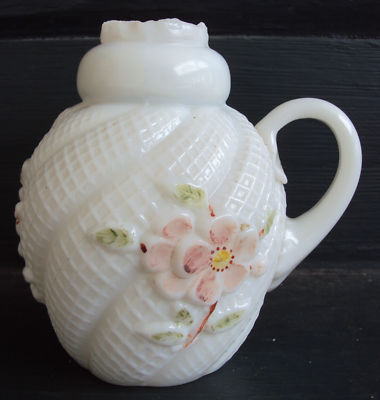 Title (ebay affiliate link): ANTIQUE VICTORIAN NORTHWOOD APPLE BLOSSOM SYRUP PITCHER MILK GLASS OPAQUE 19C
