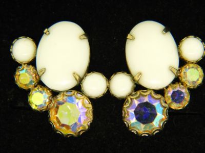 Title (ebay affiliate link): Old Signed Weiss MILK glass AB RHINESTONE VINTAGE Gold tone Clip Earrings