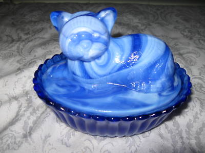 VTG Blue Swirl Westmoreland Cat in Basket Milk Glass
