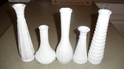 Title (ebay affiliate link): Vtg Assortment of White Milk Glass Bud Vases Ranging from 9" to 6"~all different