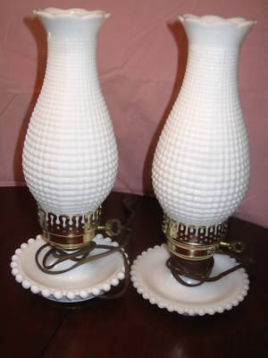 VINTAGE PAIR (2) OF MILK GLASS HOB NAIL LAMPS WITH KEY