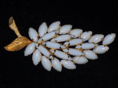 Vintage Weiss Gold Tone Milk Glass Leaf Brooch