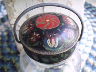 Title (ebay affiliate link): Vintage 1950s Owens-Illinois Glass Bottle Antique Tole Painted Tin Lid Folk Art
