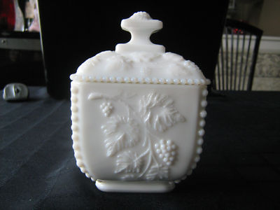 Title (ebay affiliate link): VINTAGE Westmoreland White Milk Glass BEADED GRAPE Lidded Dish Jar EXCELLENT