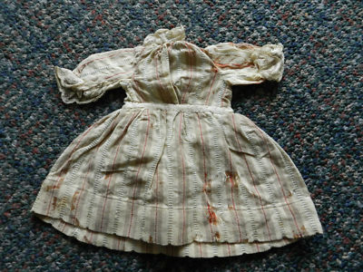 Title (ebay affiliate link): Lovely Antique TINY Wool Striped DOLL GOWN Dress China Doll Ecru LACE
