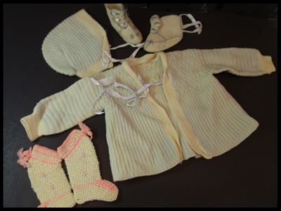 ANTIQUE BABY DOLL HAT SWEATER BOOTIES LOT 6 PCS