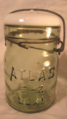 Title (ebay affiliate link): Antique Rare Atlas Olive Fruit Canning Jar with Milk Glass Lid - Great Condition