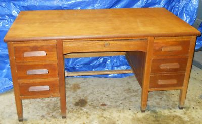 Title (ebay affiliate link): VINTAGE SOLID WOOD TEACHER'S / OFFICE DESK - 6 DOVETAIL DRAWERS - BRASS FEET