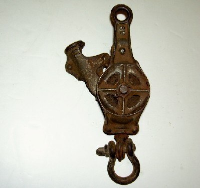 Title (ebay affiliate link): DATED 1897, CAST IRON HAY SLING DOUBLE PULLEY SYSTEM RELEASE