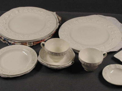 Title (ebay affiliate link): Wedgwood Cream on Cream Queensware, Embossed, 2 4-Piece Settings + 4 Extra Pcs